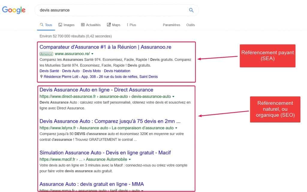 Le SEO désigne l’optimisation de la position sur les résultats naturels. Le SEA, pour Search Engine Advertising, concerne le recours à des campagnes de publicité payantes, pour apparaître en haut des résultats naturels.
