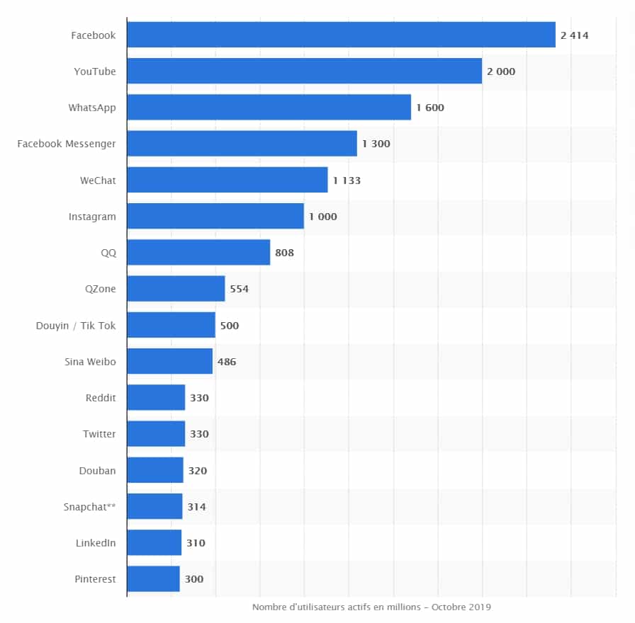 Le nombre d’utilisateurs des réseaux sociaux les plus populaires dans le monde en octobre 2019, selon Statista :